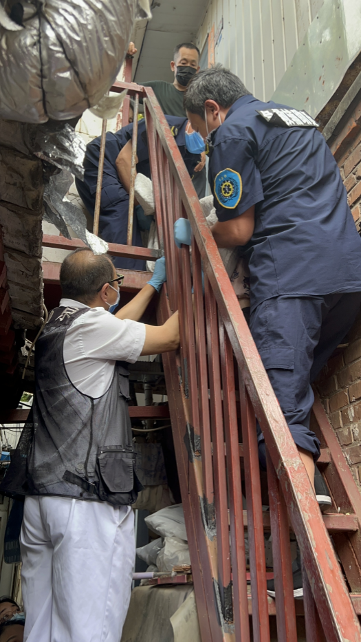 由于没有足够空间利用铲式担架搬抬,刘扬作为现场指挥,积极与家属沟通,因地制宜、果断决策,嘱担架工师傅将患者用棉被作为临时担架将患者兜起向下转运,“一人在头侧,一人在脚侧,慢慢来!”他清晰地下达指令,声音沉稳有力,狭窄的楼梯间,空气仿佛凝固,车组协力搬抬患者。“稳一点!”刘扬踩在小梯子上,将手从楼梯下方间隙里穿过托住患者颈部、臀部,小心翼翼地保护患者,“左移一点!”“拉住!”狭小空间内,强有力的指令不断发出。急救辅助员们额头青筋凸起,汗水顺着脸颊滴落,浸湿了脚下的台阶,但托举生命的双手,始终坚定有力。在令人窒息的狭窄空间里,时间仿佛被拉长。