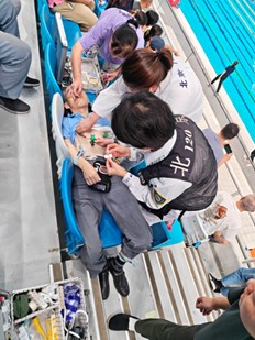 赛事期间,看台上一名70岁老年观众突然毫无征兆晕厥倒地,引起周围人群瞬间惊呼慌乱。正在场馆执行保障任务的医生李静、护士郝京晨、司机翟岐反应迅速,第一时间赶至患者身旁。李医生凭借丰富急救经验,快速评估老人意识、呼吸、脉搏等生命体征,排查晕厥原因;郝护士默契配合,协助完成各项检查操作;翟师傅迅速取来监护仪,一边维持现场秩序、安抚家属情绪,一边通过手台向赛事主办方汇报情况,随后又快速拿来铲式担架,为后续转运做好准备。