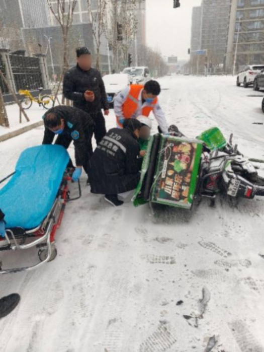北京急救中心经开急救中心站医生焦慧杰、护士刘海征、司机王艳山接到命令后立即出发。救护车在短时间内抵达了现场,此时雪花仍密集飘落,路面已被积雪染白。到达现场,急救人员携带急救设备快步来到受伤骑手身边,俯身跪在湿冷的雪地上开展专业施救。