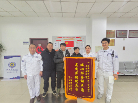 2025年12月10日上午,北京急救中心西城急救中心站内洋溢着温暖的氛围。患者家属李阿姨专程来到中心,将一面写有“暖心服务解危急,高尚医德传美名”的锦旗和一封饱含深情的表扬信送给张邯医生、陈岩岩护士和王林辉司机所在的车组,表达诚挚的谢意。