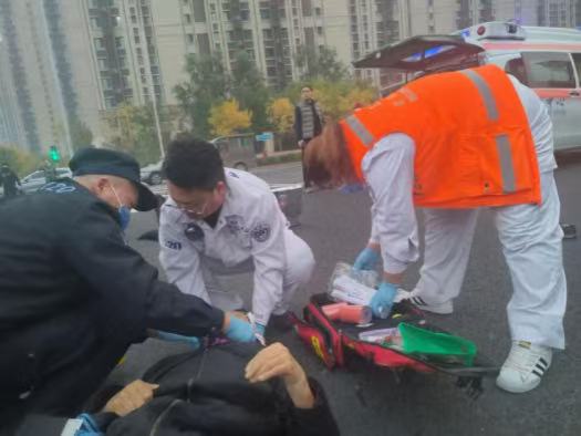途中,车组同步联系现场询问伤情,指导现场人员自救。抵达现场时,只见两位老年患者蜷卧在地上,痛苦呻吟着。急救医生王坤立即启动检伤分类流程:他俯身在伤者身旁,快速评估意识状态、目光锁定出血点、判断骨折类型——女士左下肢开放性骨折伴头皮裂伤,创口渗血不止,意识已显模糊;男士右下肢开放性骨折。王大夫果断汇报调度,请求派车支援。