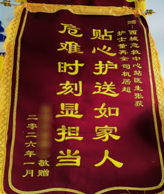 “医护司配合默契,救治搬抬专业,服务态度一流”—这是患者家属对西城急救中心站京Q9Q9D6车组的诚挚评价。2026年1月19日,因多次优质、专业的服务,患者家属特意送来锦旗:“贴心护送如家人,危难时刻显担当”。短短十四字,凝结着由衷的认可与深厚的感激。经了解,近段时间,患者因病3次呼叫急救车,恰巧均为该车组执行,他们以行动诠释:真正的急救,始于专业,成于温情;每一次出发,都是对生命最郑重的承诺;每一次任务视为技术与关怀的双重考验。操作规范严谨,配合默契无间,在确保医疗安全的基础上,他们更以细致的照护传递温暖“一声安抚、一个动作、一份体贴,让患者在危急时分也能感受到安心与尊严”。
