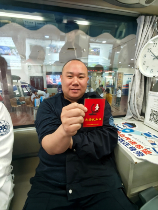 刘强师傅是一名经验丰富的急救辅助员,跟着急救车组到现场协助搬抬患者是他最主要的任务。干这行9年了,抬过多少人他自己都数不清。从老旧小区的十几层楼,到交通意外现场的破碎路面,他和搭档用坚实的臂膀把一个个患者送上救护车,又护送入医院诊室。“咱干的是有技术含量的力气活,患者能活下来都不容易,咱能帮一把是一把。今天看大家这么踊跃,我也想把自己的血献出去。血进了谁的身体,那就是又救了一个人。”他说得朴实,笑得憨厚。