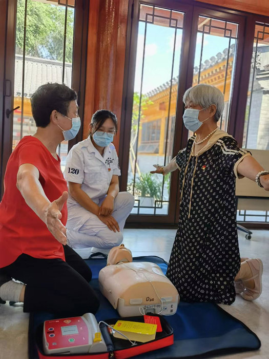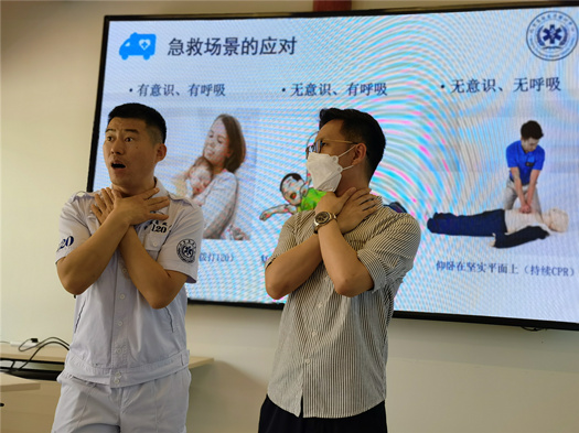 随后,西城急救中心站院前急救医生白海龙为现场人员进行了“心脏拯救者”的主题讲座,用风趣幽默、通俗易懂的方式向大家讲解了现场急救的重要性及如何进行现场急救等,并通过模拟人向大家展示了AED自动体外除颤仪的使用。讲座结束,在老师的指导下,大家分为两组积极进行心肺复苏及AED使用的实际操作练习。